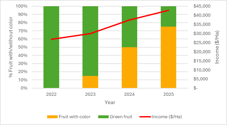 In 2022, 100% of ‘Keitt’ mangoes in the evaluated orchards remained green at harvest. In 2023, following the optimized program, the proportion of colored fruit increased dramatically – nearly doubling the growers’ income.