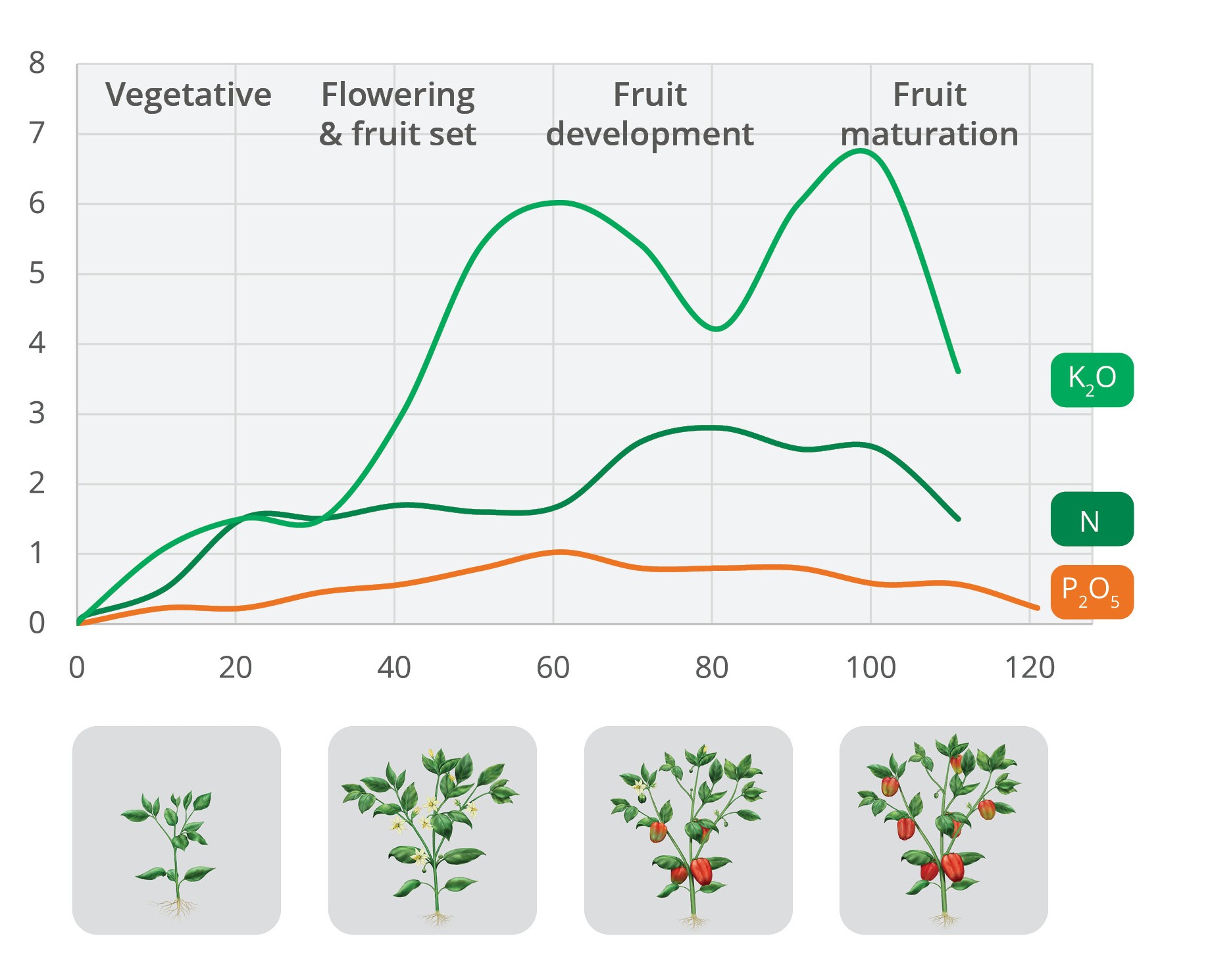 From the onset of flowering through fruit maturation, potassium demand rises significantly, aligning with the plant's fruit development needs. To support this, high nitrogen application is required early in the growing season, followed by supplemental applications after fruit initiation.