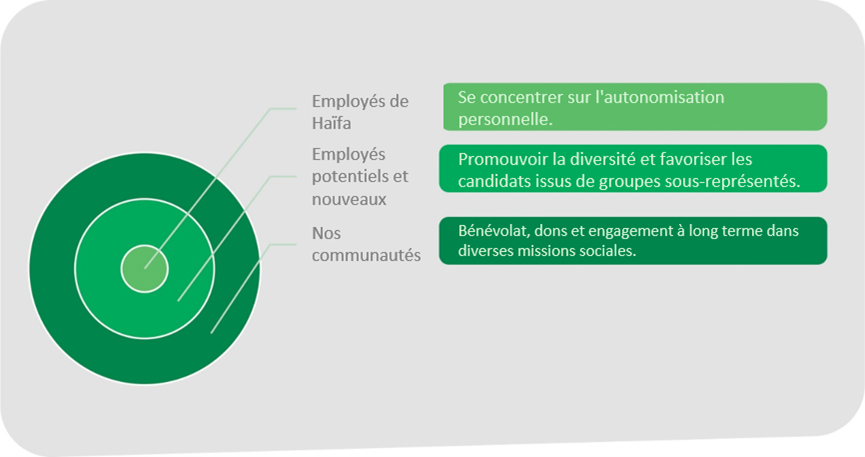 Notre stratégie d'IMPACT social s'articule autour de trois cercles interdépendants : Les salariés du groupe Haifa, les employés potentiels et nouveaux, ainsi que nos communautés.