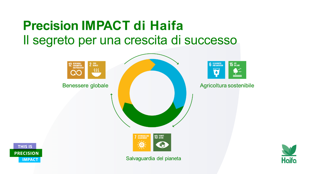 La visione di Haifa è quella di un mondo in cui i bisogni essenziali di ogni individuo siano soddisfatti, garantendo al contempo un equilibrio duraturo delle risorse e un impatto ambientale minimo. Supportiamo i coltivatori nell'adozione di pratiche agricole sostenibili che garantiscano sia la salute del pianeta che il benessere globale. Le azioni di Impact mirano a dare un contributo scalabile a sei degli Obiettivi di sviluppo sostenibile (Sustainable Development Goals, SDG) delle Nazioni Unite, sostenendo i tre pilastri fondamentali per un progresso duraturo: benessere globale, agricoltura sostenibile e salvaguardia del nostro pianeta
