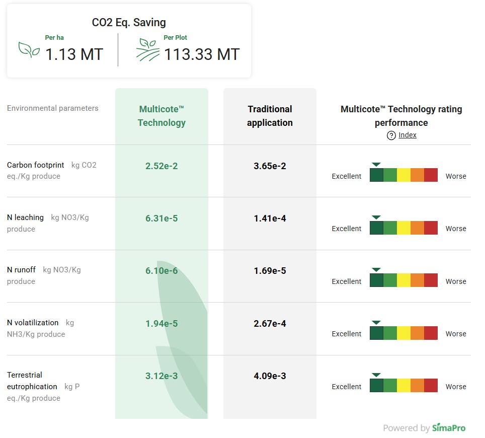 Carbon footprint calculations performed using the MultiMatch™ Carbon Footprint Calculator indicate that Multicote™ Agri application reduced greenhouse gas emissions by 1.13 ton CO₂-eq per hectare, equivalent to 25.2 kg CO₂-eq per ton of harvested yield.