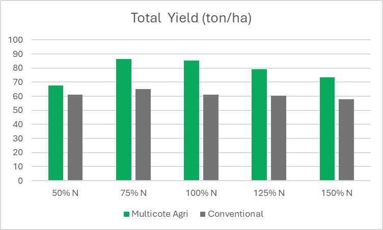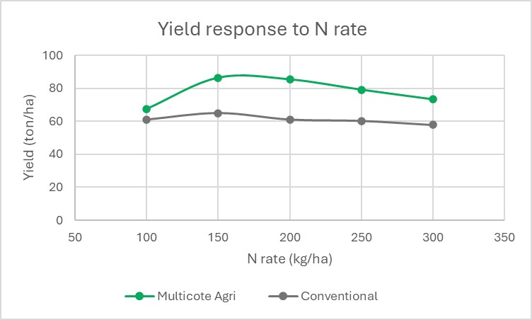 While mineral programs showed relatively flat yield responses despite increasing nitrogen inputs, Multicote™ Agri treatments followed a classic yield-response curve, with optimal performance at 75–100% of the estimated nitrogen demand.