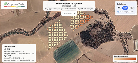 En Ofakim, Croptune™ se integró con mapeo semanal mediante drones, combinando porcentaje de nitrógeno (N%), datos NDVI y análisis espacial del campo.