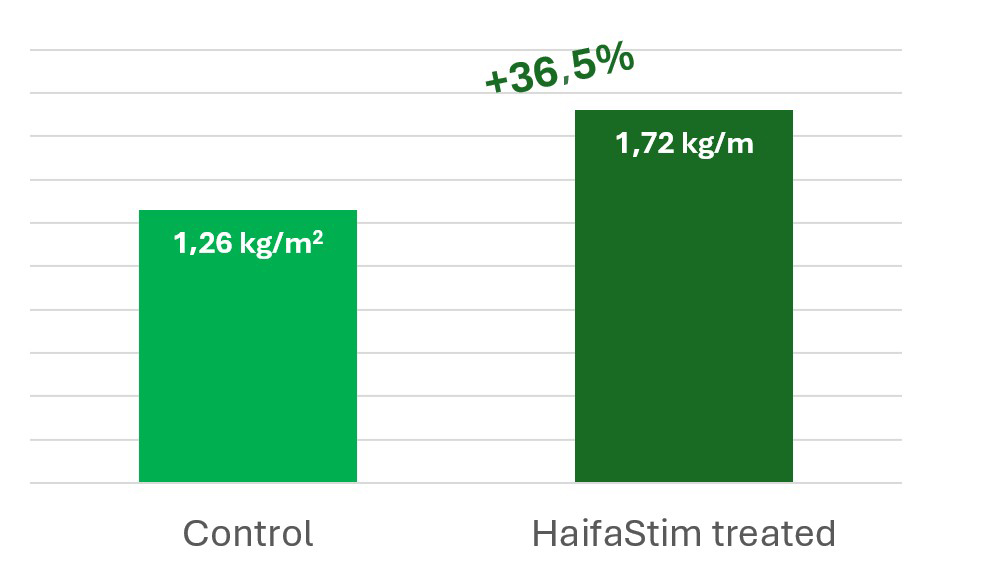 A pesar de estar incluso algo más afectadas por la presión del virus, las plantas tratadas mantuvieron una fuerte productividad, lo que destaca el efecto de mejora de la resiliencia de la estrategia HaifaStim™.