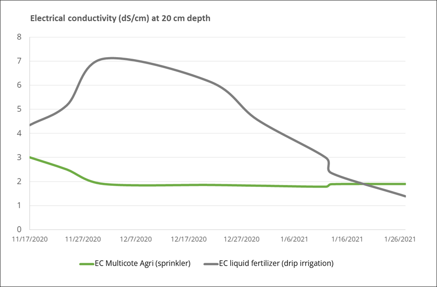 - Apply controlled-release solutions such as Multicote™ Agri, which helps prevent salt buildup in the root zone (see graph below).