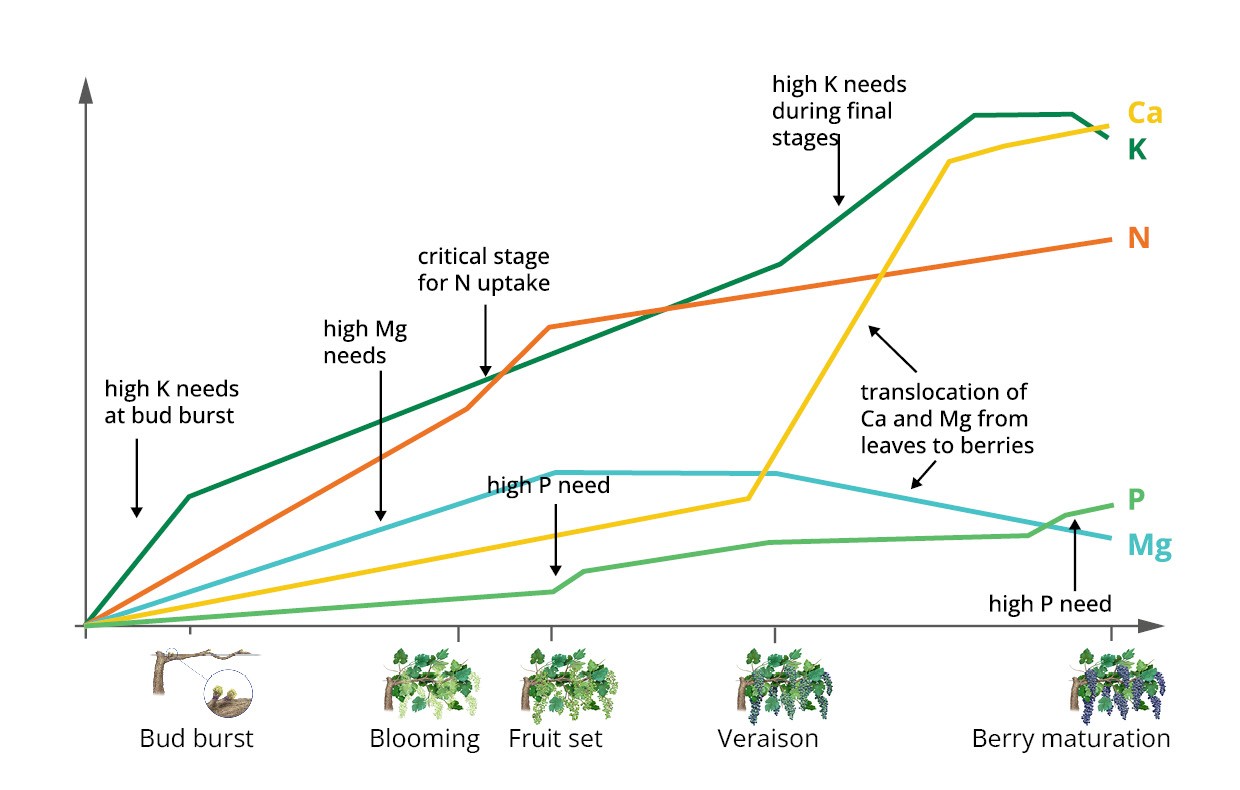 Nutrient uptake in vineyards varies by growth stage, reflecting the physiological processes occurring at each phase: