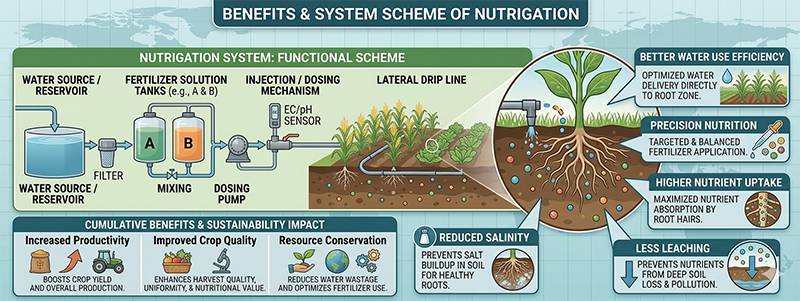 When drip irrigation is combined with fertigation (Nutrigation™), nutrients are supplied together with irrigation water in small, frequent doses. This approach maintains nutrients in the active root zone, improves nutrient uptake efficiency, and reduces losses through leaching or volatilization. It also helps prevent excessive salt accumulation in the soil.