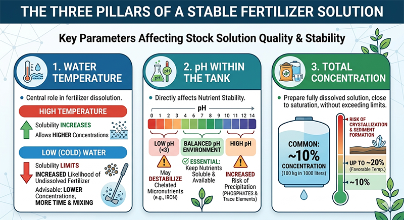 Water temperature plays a central role in determining how much fertilizer can dissolve. As temperature rises, solubility increases, allowing higher concentrations to be achieved. In contrast, cold water limits solubility, increasing the likelihood of undissolved fertilizer that practically doesn't reach plants. In such conditions, it is advisable to work at lower concentrations and allow more time and mixing to ensure full dissolution.