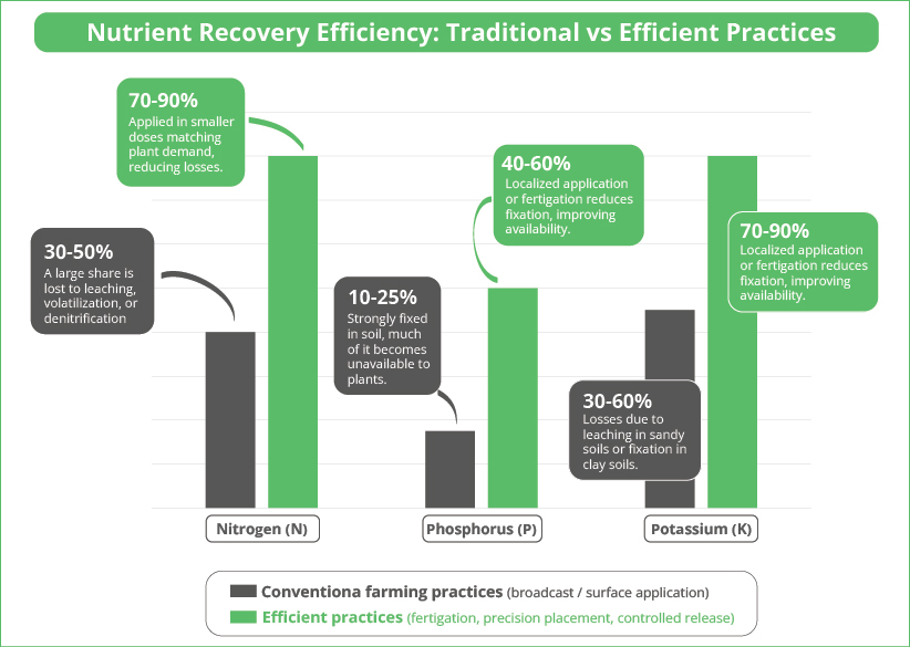 - Application method – Inefficient broadcast application causes higher losses compared to precision techniques like fertigation or CRF.