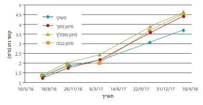 | שנה שנייה (2017) | עידית 9-0-6 / 7 יח' חנקן לדונם | 200 (3.6) | 250 (4.5) | 300 (5.4) |