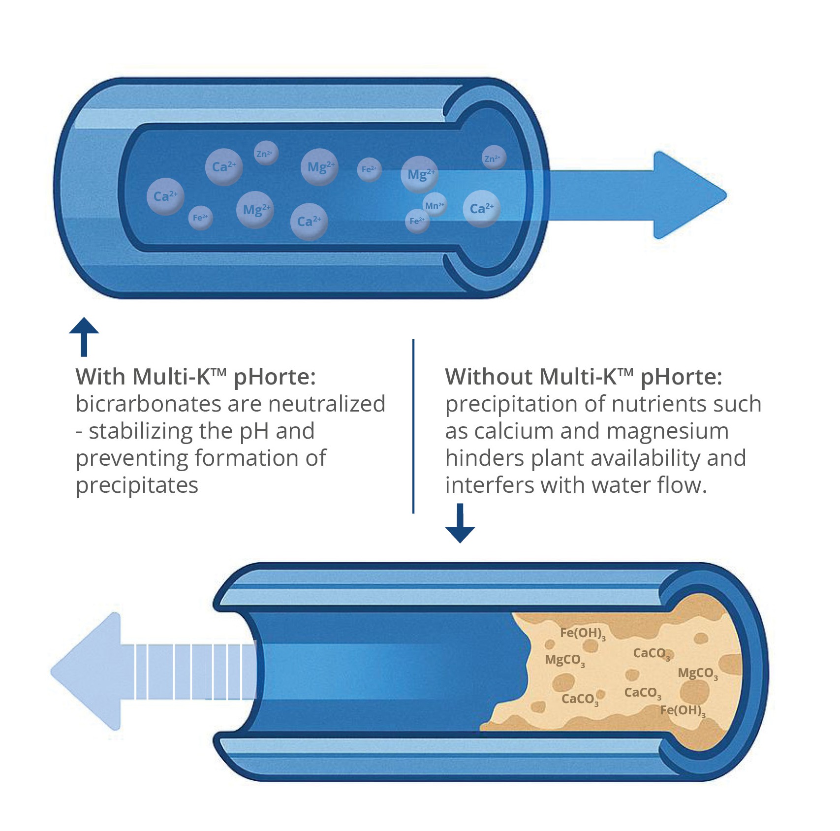 1 kg of Multi-K™ K-pHorte added to a 1000-liter tank neutralizes approx. 6.5 mg/l CaCO3 (or 0.1 mmol/l HCO3). A single bag of 25 kg effectively neutralizes concentrations of 163 mg/l CaCO3 (or 3.3 mmol\l HCO3-). This action stabilizes the solution pH, prevents precipitation of nutrients such as calcium and magnesium, and ensures that they remain available for plant uptake. In addition, it helps maintain smooth water flow by preventing irrigation passages clogging.