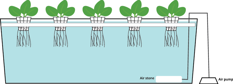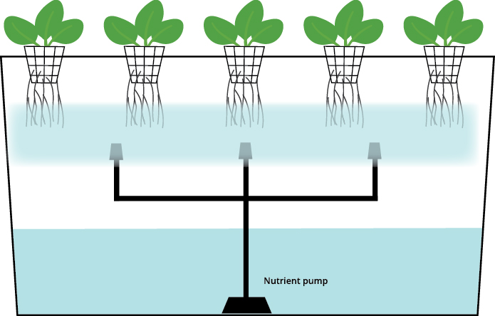 As raízes ficam suspensas em uma piscina estática de solução nutritiva.