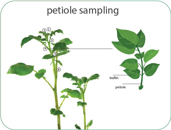 A amostragem de nitrato de pecíolo permite o monitoramento na estação do estado nutricional da cultura. Recomenda-se coletar o 4o pecíolo de 30 a 50 plantas selecionadas aleatoriamente em todo o campo. Amostras de tecido são frequentemente coletadas toda semana para rastrear mudanças nos níveis de nitrato e para planejar aplicações suplementares de fertilizantes, caso os níveis caiam abaixo do ideal. Os níveis críticos de nitrato no pecíolo diminuem à medida que a cultura da batata se desenvolve e amadurece. Geralmente, os níveis de nitrato no pecíolo-N no enchimento do tubérculo são <10.000 ppm = baixos, 10.000-15.000 ppm = médios, >15.000 ppm = suficientes.