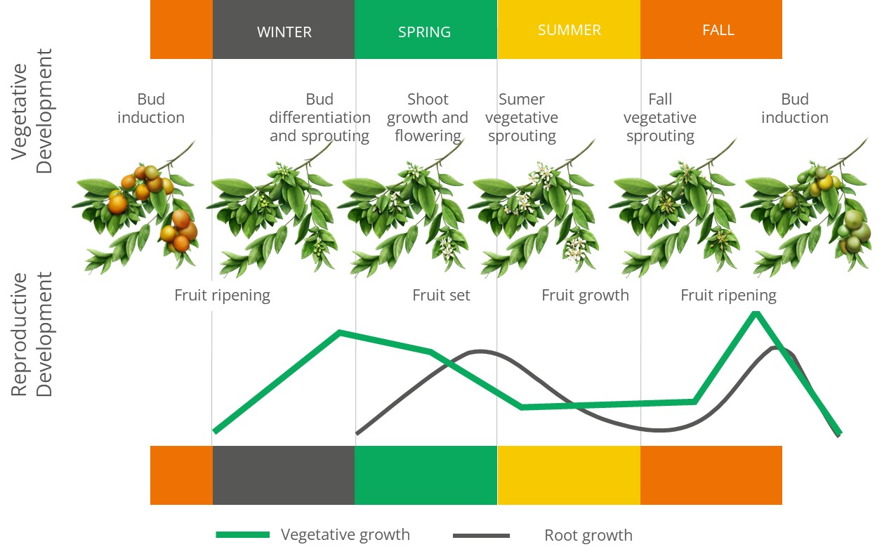 Effective nutrition begins with understanding citrus growth cycles. Citrus trees move through distinct physiological stages, including bud induction, bud differentiation, flowering, fruit set, fruit development, and post-harvest recovery. Each stage places different nutrient demands on the tree.